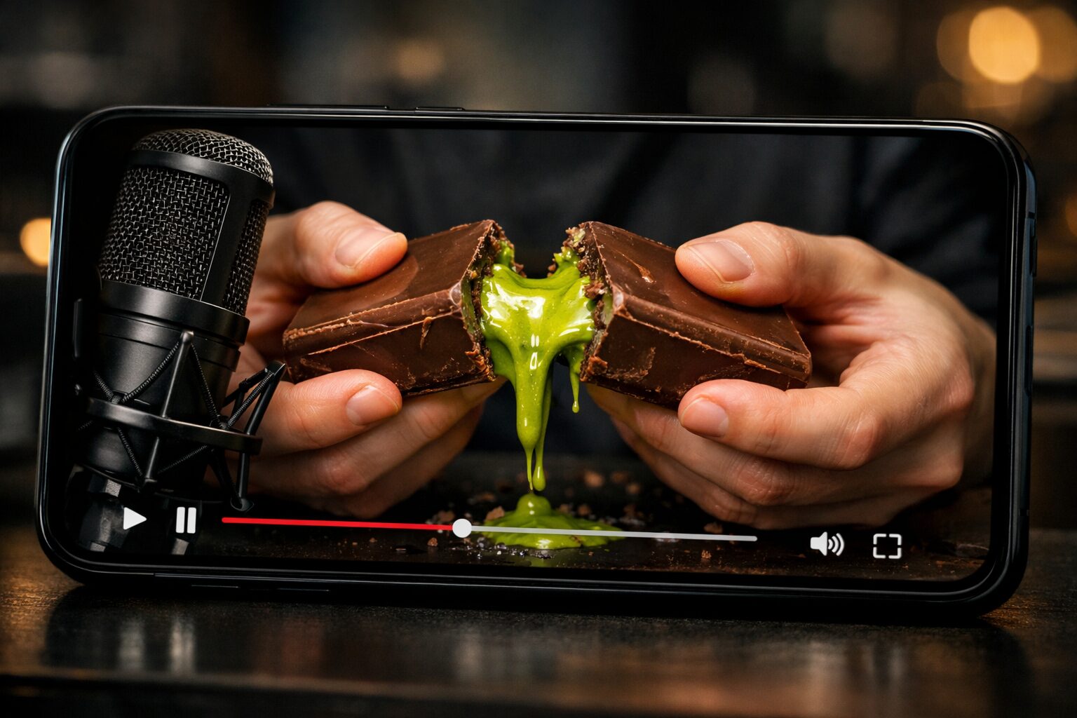チョコレートを割ったときに溢れ出る鮮やかなグリーンのピスタチオペーストと、噛むたびに鳴る「ザクザクッ」という心地よい音が、視聴者の視覚と聴覚を強く刺激したのです。