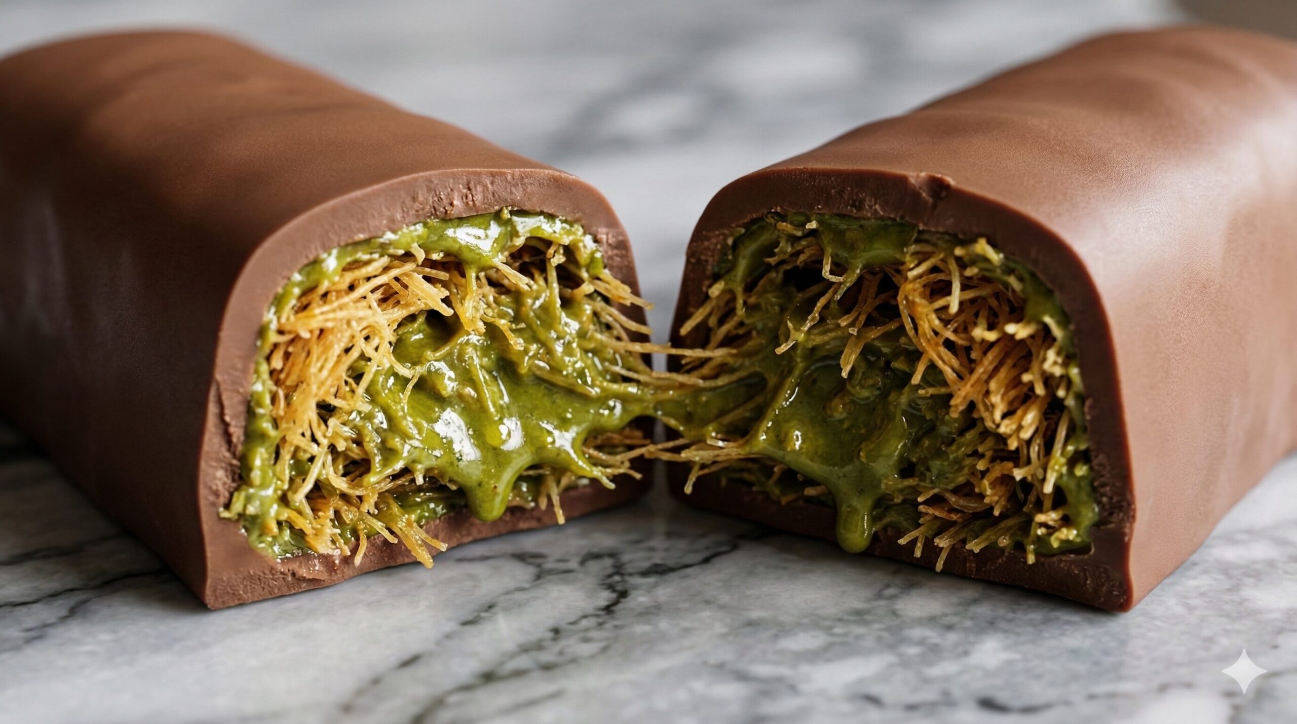 なめらかなミルクチョコレートのコーティングの中には、濃厚なピスタチオペーストと、中東の伝統的な細麺状生地「クナファ(カダイフ)」がこれでもかというほどたっぷりと練り込まれています。