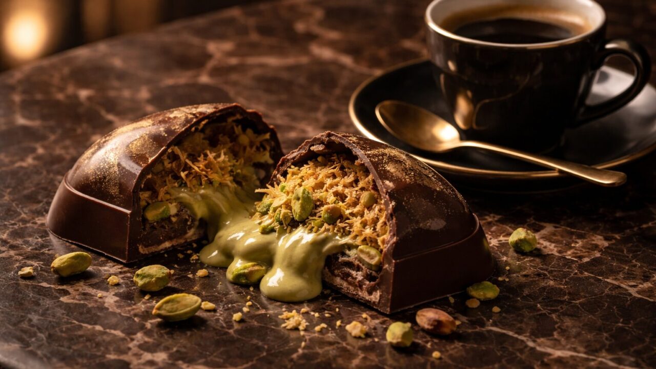 ドバイチョコは、ピスタチオの濃厚な風味とカダイフ(中東の細麺状の生地)のザクザクとした食感が特徴的な、中東発祥のスイーツです。