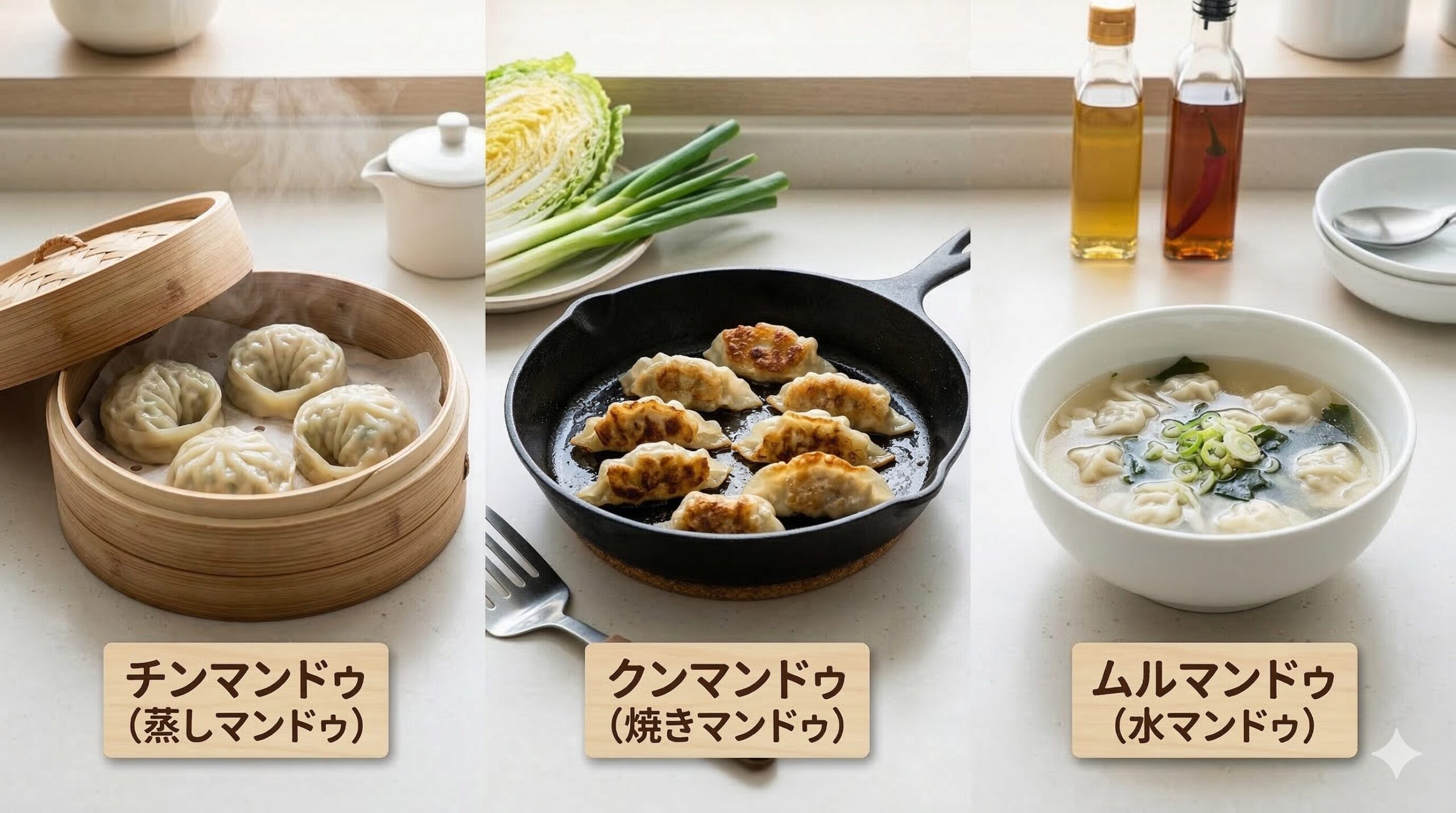 例えば、蒸し器でふっくらと仕上げたものを「チンマンドゥ」、フライパンでカリッと焼いたものを「クンマンドゥ」と呼びます。