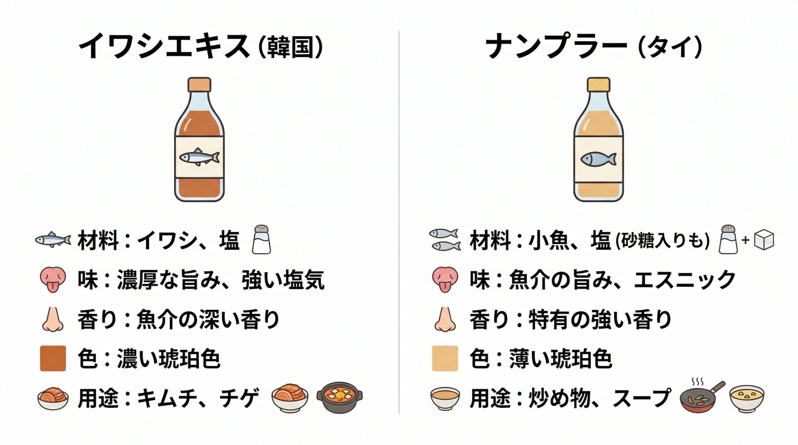 どちらも小魚を塩漬けにして発酵させた調味料ですが、タイのナンプラーは香りが非常に強く、商品によっては砂糖が加えられて甘みがあるのが特徴です。