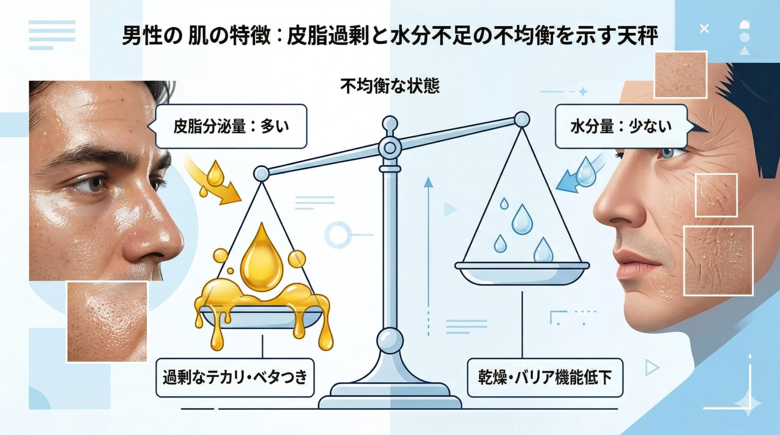 男性の肌は女性に比べて皮脂の分泌量が多く、その一方で水分量が少ないという特徴があるため、毛穴が詰まりやすい傾向にあります。