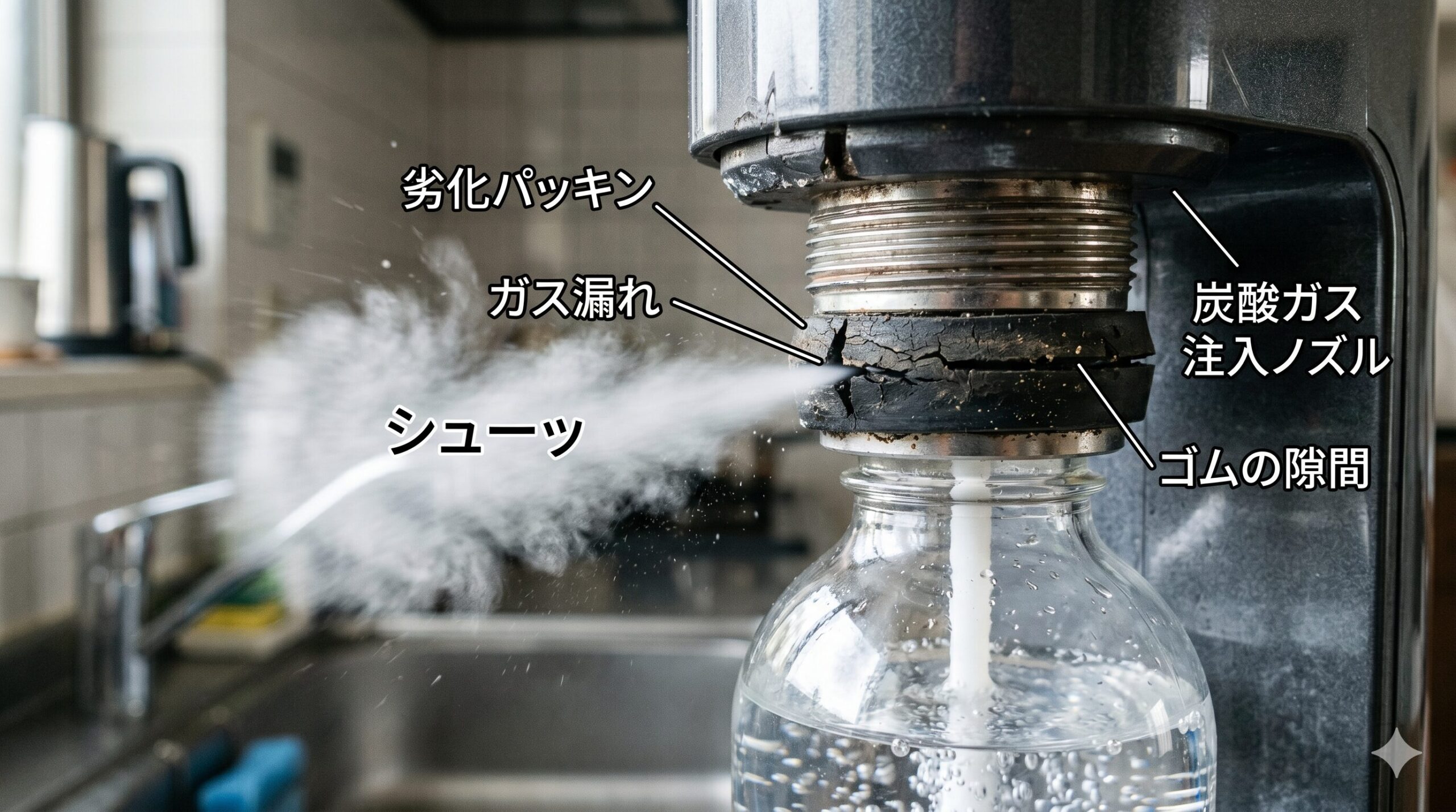 ここが劣化すると、ガスを注入した際に「シューシュー」と音がしてガスが外に漏れてしまい、うまく水に溶け込まなくなります。