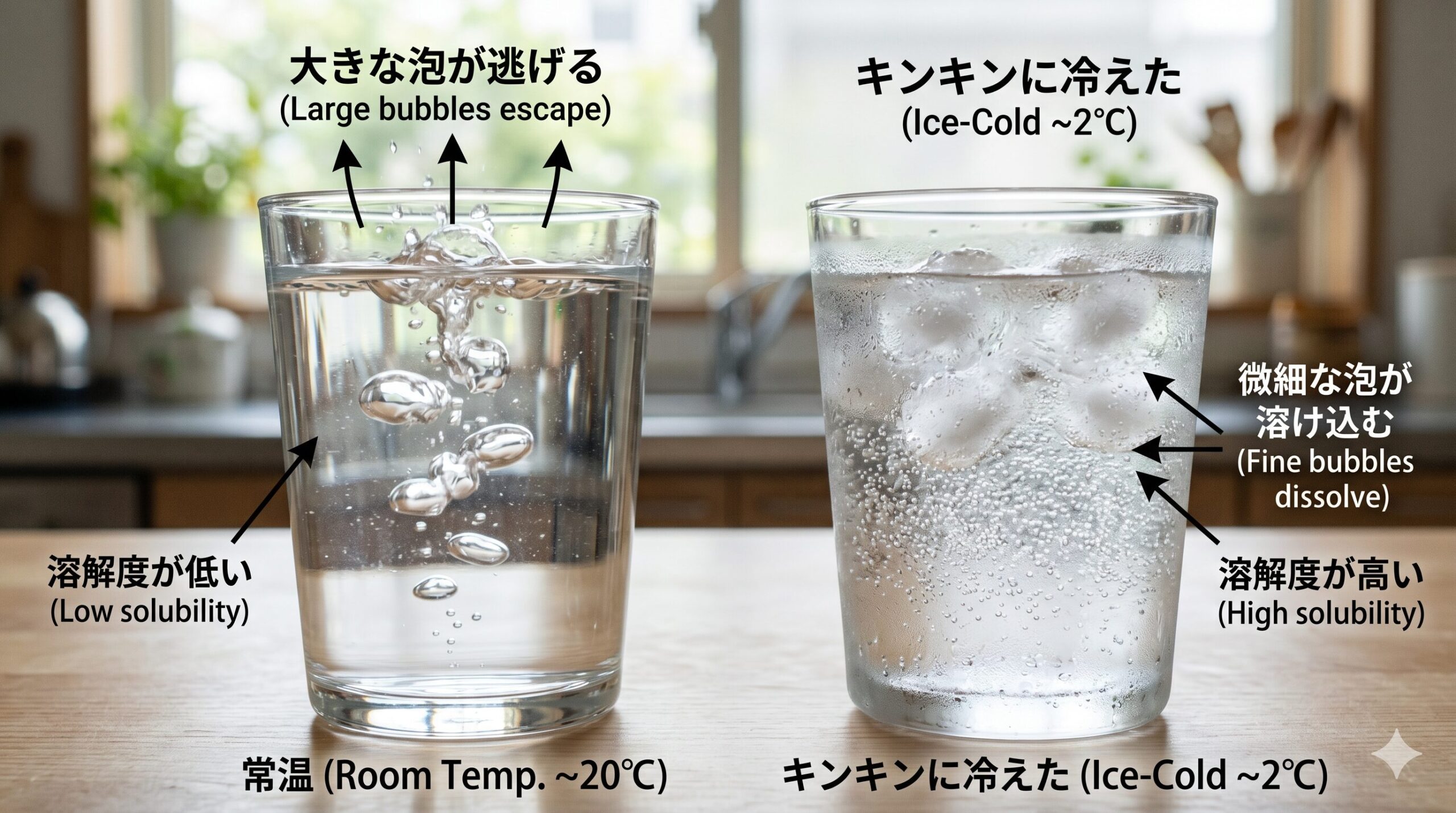 そのため、水道から出したばかりの常温の水を使用すると、ガスが水に溶け込まずに空気中へ逃げてしまいやすくなります。